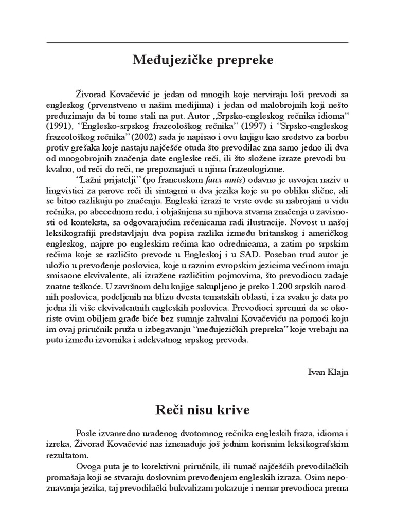 Zivorad Kovacevic Lazni Prijatelji U Engleskom Jeziku Zamke Doslovnog Prevodjenja